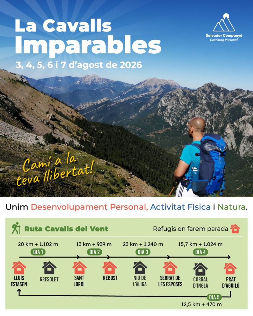 Així que et presento una EXPERIÈNCIA transformadora de veritat. Una experiència MEMORABLE en què et tornaràs IMPARABLE. Tant real com la vida mateixa. Unim en una mateixa experiència Desenvolupament Personal, Activitat Física i Natura -un recés en moviment- per desfer-te de l’angoixa, alliberar-te de les pors i buidar la ira i el ressentiment, per accedir a un estat intern òptim, ple de recursos, on connectes amb la teva essència i despertes habilitats i capacitats, el poder intern i el propòsit que marcarà el teu esdevenir. En un marc incomparable… no hi ha altra opció possible. És Sí o Sí, és Ara o Ara, connectaràs amb tu mateix, sabràs el que necessites i despertaràs la vitalitat per assolir-ho.